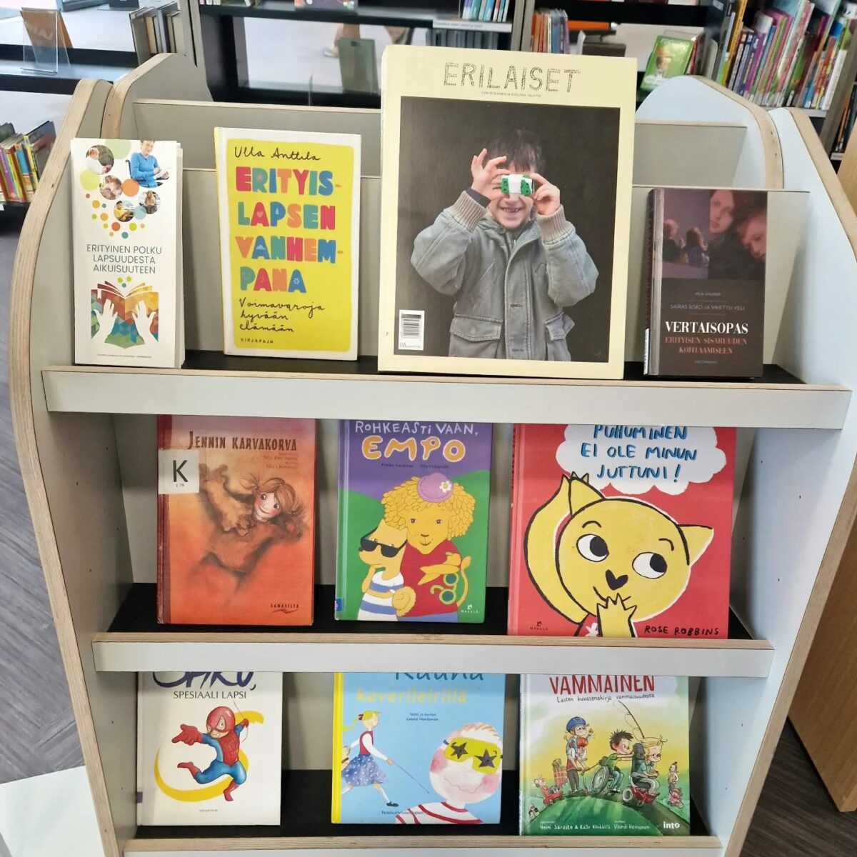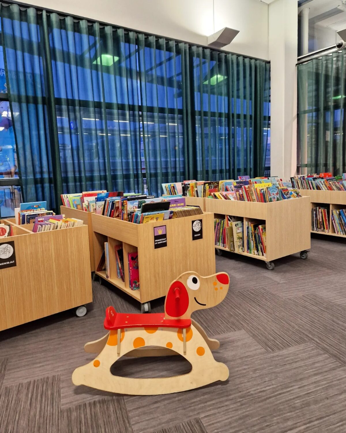 Myyrmäki Library, located in Myyrmäkitalo complex, spans two floors and shares the building with a movie theater, art museum, and other cultural facilities. The first floor features customer service, borrowing stations, collections, and an event space. The second floor offers quiet reading areas and a periodicals section. The library’s spacious layout and varied spaces make it suitable for families, with room for children to explore while parents browse. Regular events and activities are held in the dedicated event space, and the library serves as a community gathering spot where families can spend time together.